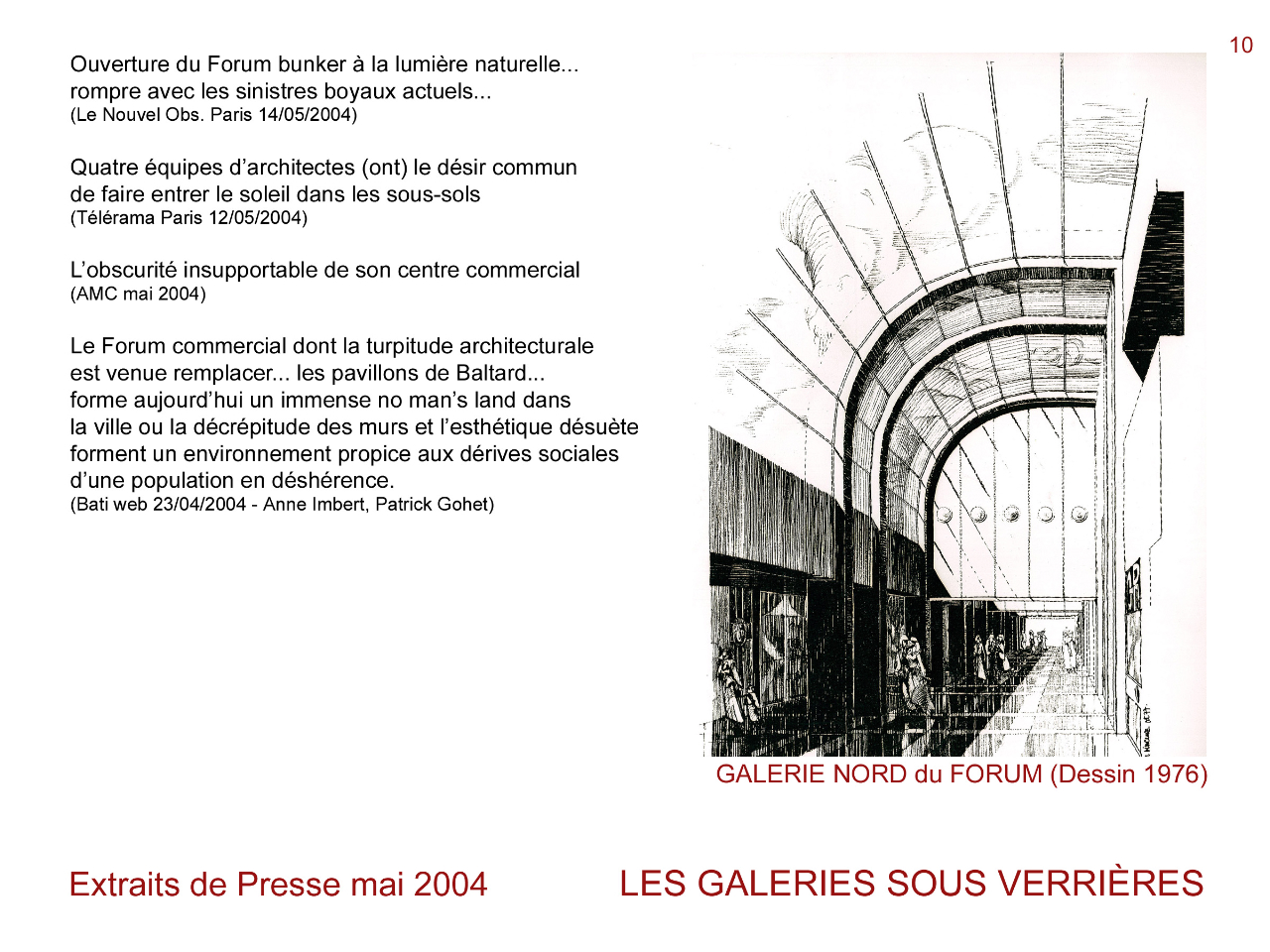 Je doit bien avouer qu'il m'a convaincu, par sur tout les points bien sûr, mais au moins sur les erreurs qui ont été décidées notamment en matière de plan masse (plans du jardin sans logique urbaine, destruction de la place Cassin - celle de la tête), d'insertion urbaine (accès à la gare RER non résolu, lien avec le jardin pas logique, pas de porosité sur les rues environnantes, pas de perception du toit depuis la rue Lescot) et surtout d'accès à la lumière (couverture complète opaque du trou visite sur la coupe du fait de sa structure trop importante, couvrement des passages, réduction du trou ect...)