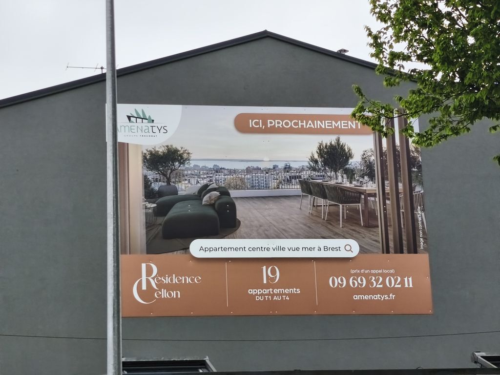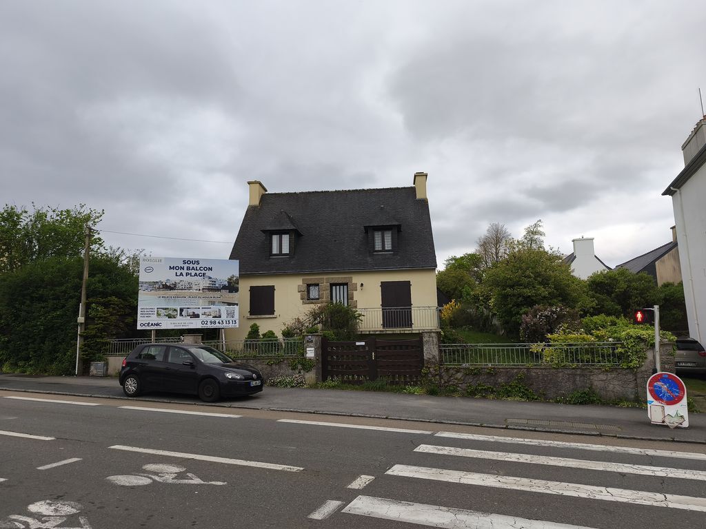 Au 46 rue de Quimper, pavillon inhabité sur un grand terrain, un panneau publicitaire "OCEANIC" pour un autre programme au Relecq est implanté dans le jardin depuis plusieurs mois.