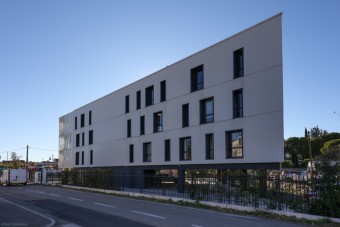 Immeuble de bureaux à la croisée de la traverse du Mas Rouge et de l'avenue Georges Frêche, ce projet remplace une maison et prend place dans le périmètre de l'opération d'aménagement d'ensemble Ode à la Mer.