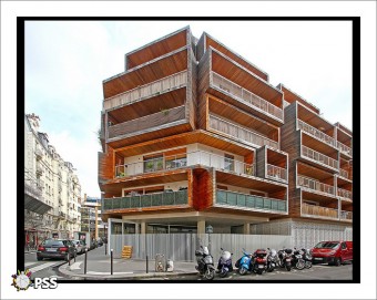 Ce bâtiment d'angle regroupe 69 logements locatifs sociaux, ainsi qu'un gymnase et une salle de danse semi-enterrés.