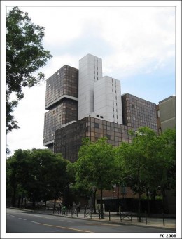 Les premiers étages fonctionnels (à partir du 4e) sont suspendus au-dessus des amphithéâtres disposés à la base de l'édifice et formant un socle. Le toit des amphithéâtres est accessible.