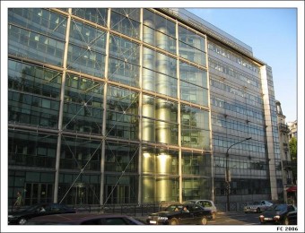 Un parvis creusé dans la façade, deux fûts d'ascenseurs traversant l'immeuble jusque au toit, une porte monumentale, une façade coulissante en verre et croisillons de métal de 32mx24m fermant le parvis à volonté, l'institution est ici explicitement symbolisée. L'immeuble est en inox et aluminium, et reste volontairement très visible.