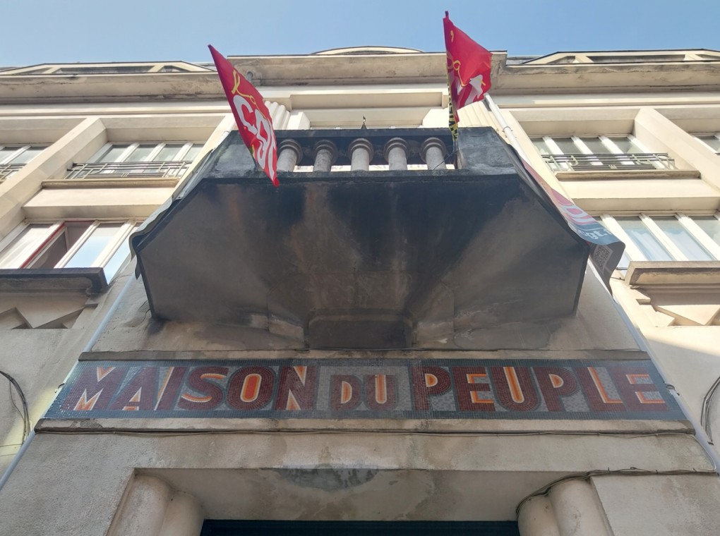 Vue depuis l'entrée principale, présence de l'inscription "Maison du peuple" réalisée en mosaïque.
