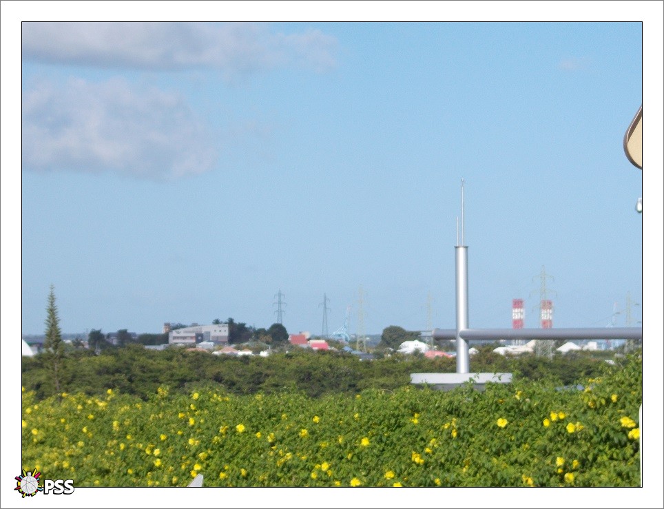 Une vue des centrales EDF et des portiques du port de Jarry depuis une rue de Moudong